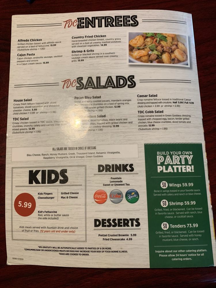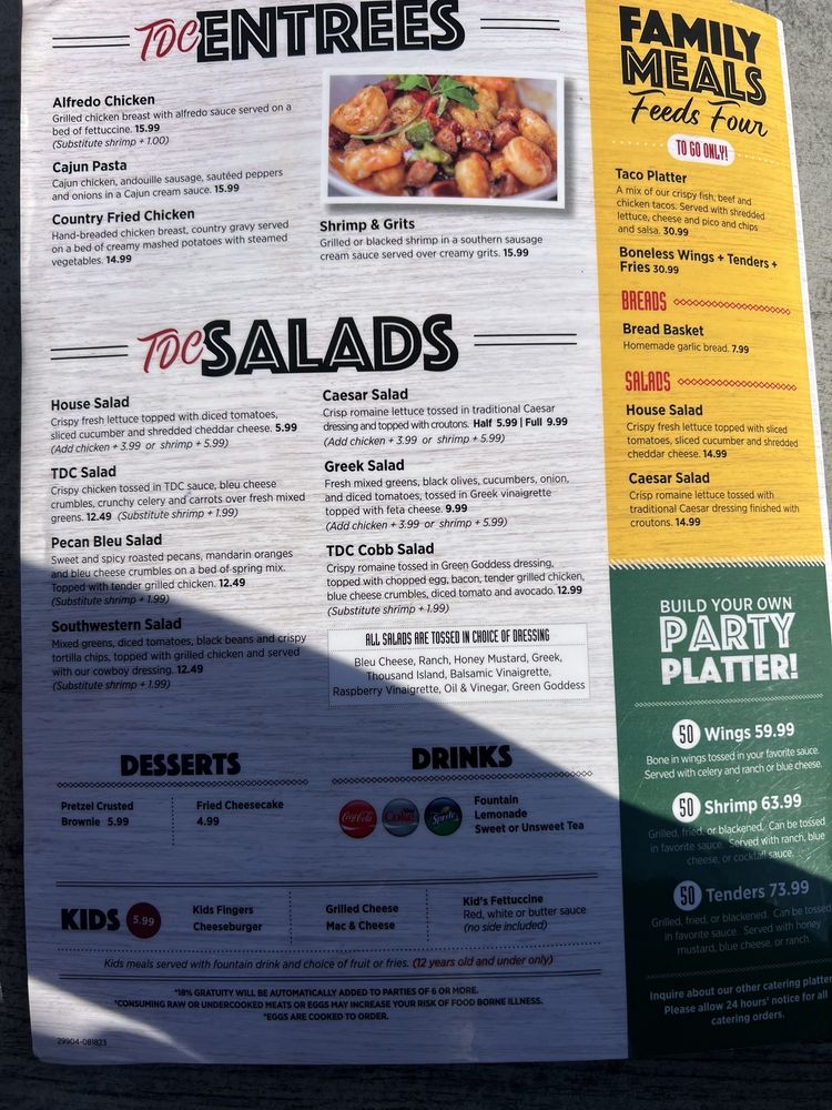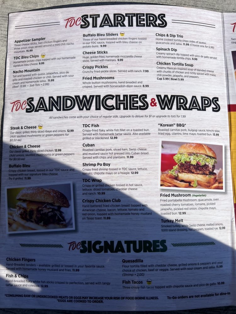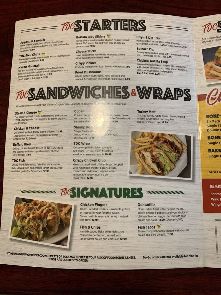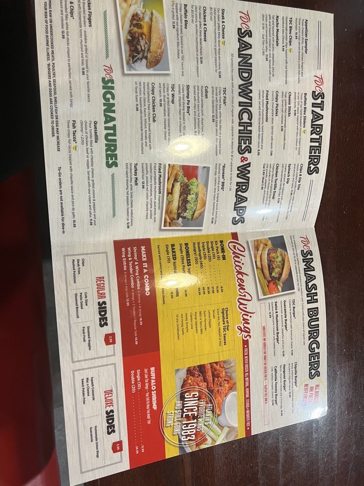 Introducing the menu at Three Dollar Cafe, a sports bar in McDonough, GA, offering American cuisine with a focus on chicken wings. The restaurant boasts a variety of starters like the Appetizer Sampler and TDC Bleu Chips, as well as unique sandwiches and wraps such as the Buffalo Bleu and TDC Fish. Customers rave about the flavorful dishes, with one reviewer praising the crispy and delicious TDC fish sandwich. The restaurant's signature chicken fingers and fish & chips are also popular choices among diners. With a welcoming atmosphere and attentive service, Three Dollar Cafe is a must-visit for those craving wings and classic American fare. Don't miss out on their $10 lunch menu specials before 2pm for a great value dining experience.